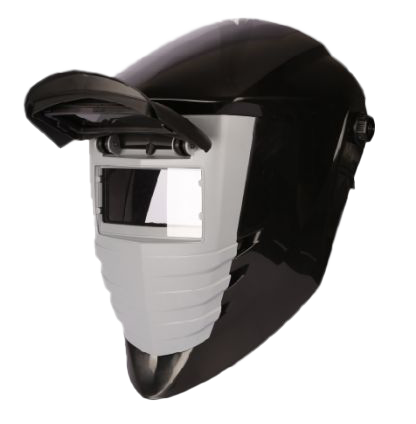Pantalla transparente fabricada en policarbonato para protección de rostro con árnes y soporte.